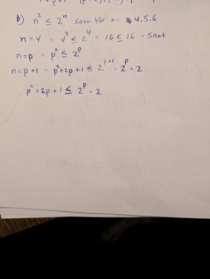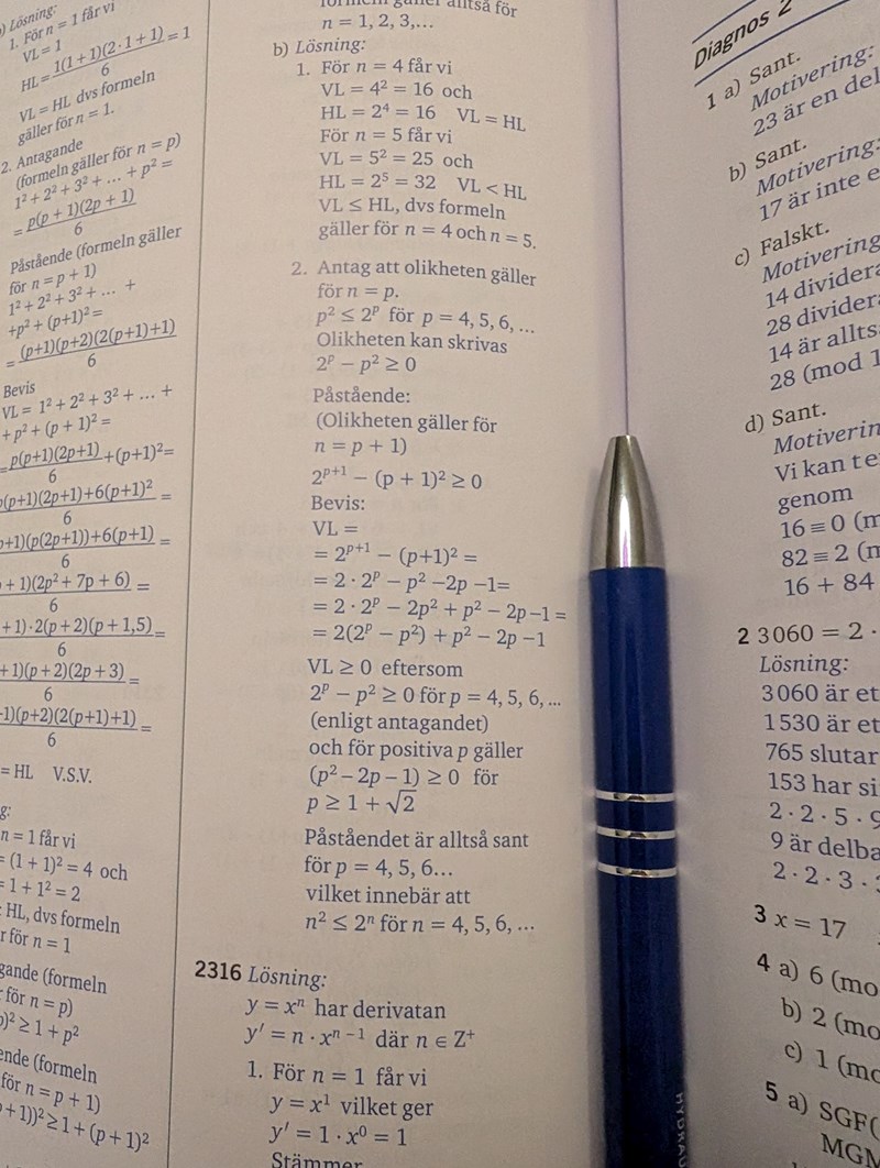Här är facits svar.. längst ned där dom räknar VL så har man 2×2^(p) - p^(2) -2p -1, sedan i nästa rad transformeras det här på något sätt till 2×2^(p) -2p^(2) + p^(2) -2p -1. Vart kommer det ifrån? Jag kommer aldrig lära mig det här det är bara så, hänger aldrig med när någonting skrivs om. Försöker förstå men för mig har man vänt upp och ned på hela uttrycket och jag klarar helt enkelt inte av att förstå vad man gör, jag ser det inte.