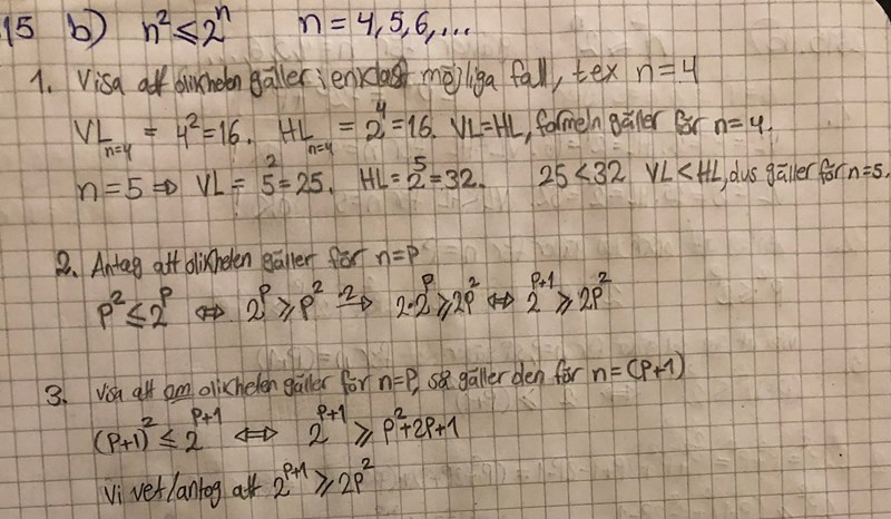 Visa att olikheten n^2 <_ 2^n gäller för n=4,5,6,…