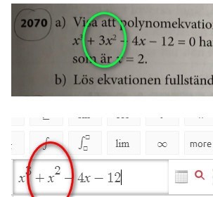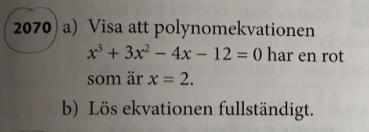 Detta är nog basic matte men jag undrar, nu när jag har fått ett noll ställe och enligt faktorsatsen har (x-2) som en faktor i polynomet. Gör en polynomdivision för att lösa ekvationen fullständigt får jag att x=2 , x=-2 , x-3.