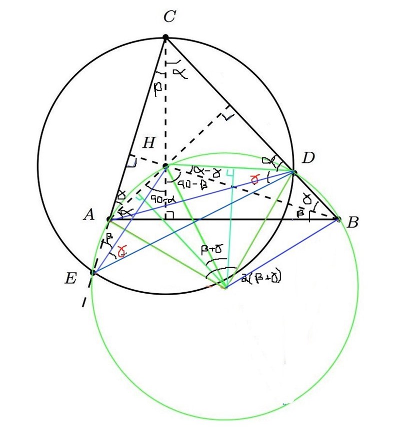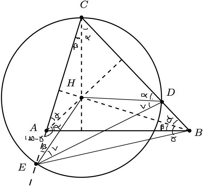 Poängen med min skiss är att mha. satsen "Randvinklar till en halvcirkelbåge är räta vinklar" kan vi visa att punkterna B,D,H,A,E ligger på en cirkel.