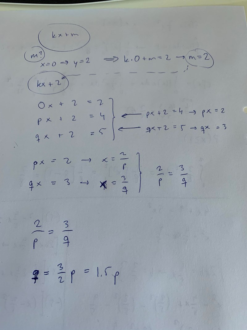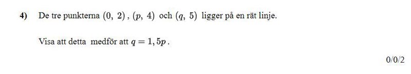 Sedan kan du använda formen för räta linjen, y=kx + m med m-värdet insatt och sätta in koordinaterna för de andra två punkterna och därmed få 2 ekvationer (i variablerna p, q och k) .Då går det att jobba med detta ekvationssystem så att du får bort k och kan uttrycka q i p.