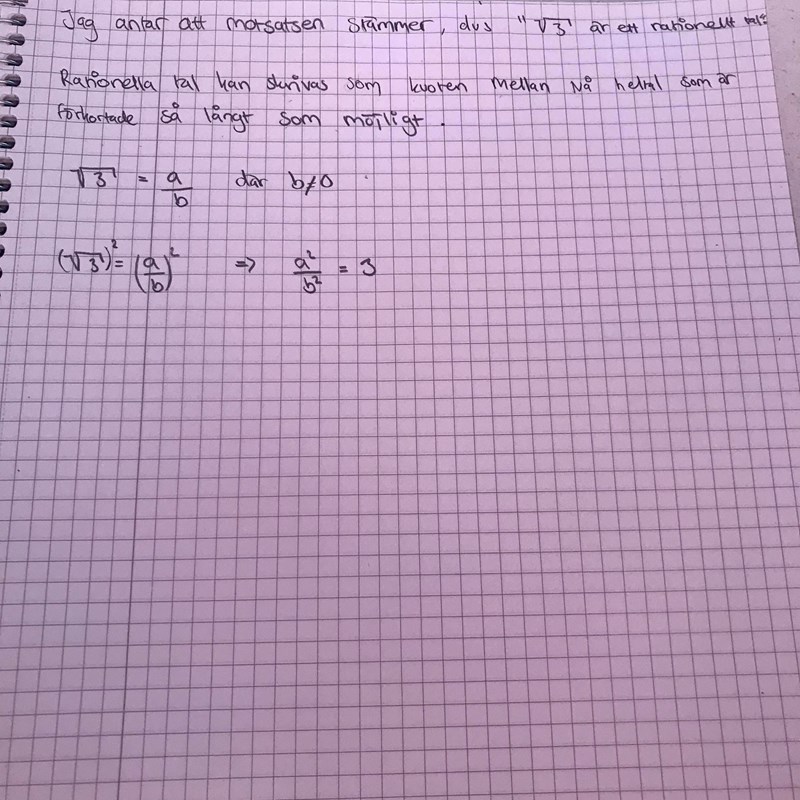 Det jag har börjat med är att bevisa motsägelsen, försöka bevisa att roten ur tre är ett rationellt tal. Såhär har jag ställt upp det: