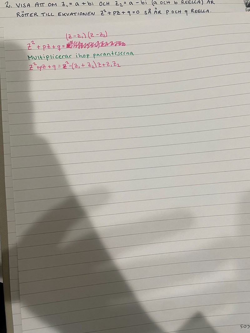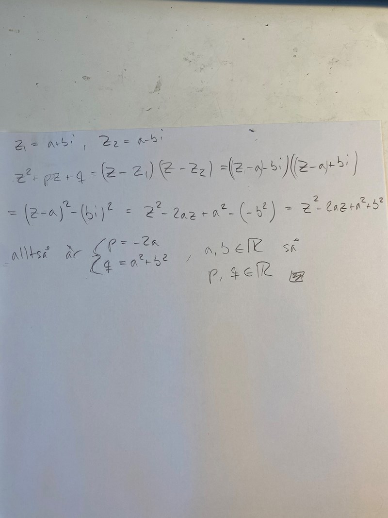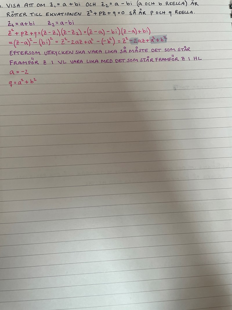 Alltså såhär? Eller ska jag skriva z^2+pz+q=z^2-2az+a^2+b^2 först och sen då se att a= -2 och q=a^2+b^2?