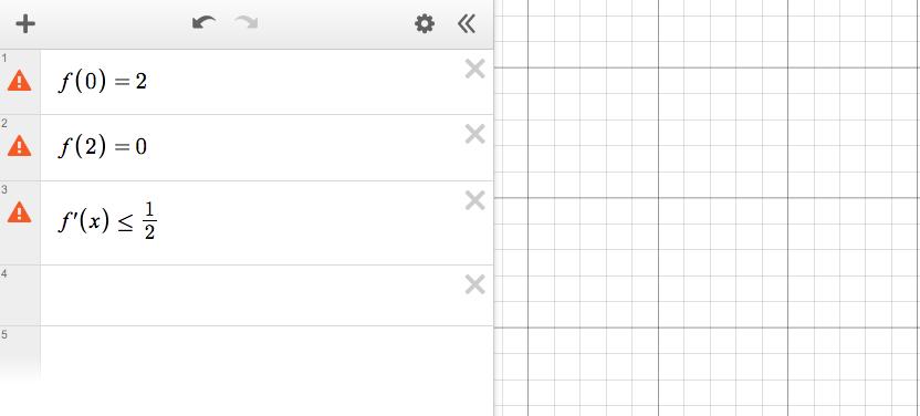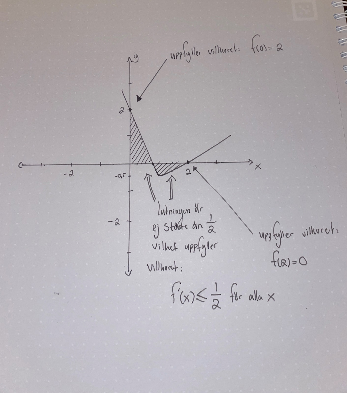 Låt grafen störtdyka från (0,2) så brant det bara går och så långt ner det bara går samtidigt som den därefter ska arbeta sig upp till (2,0) med en lutning som inte överskrider gränsen: