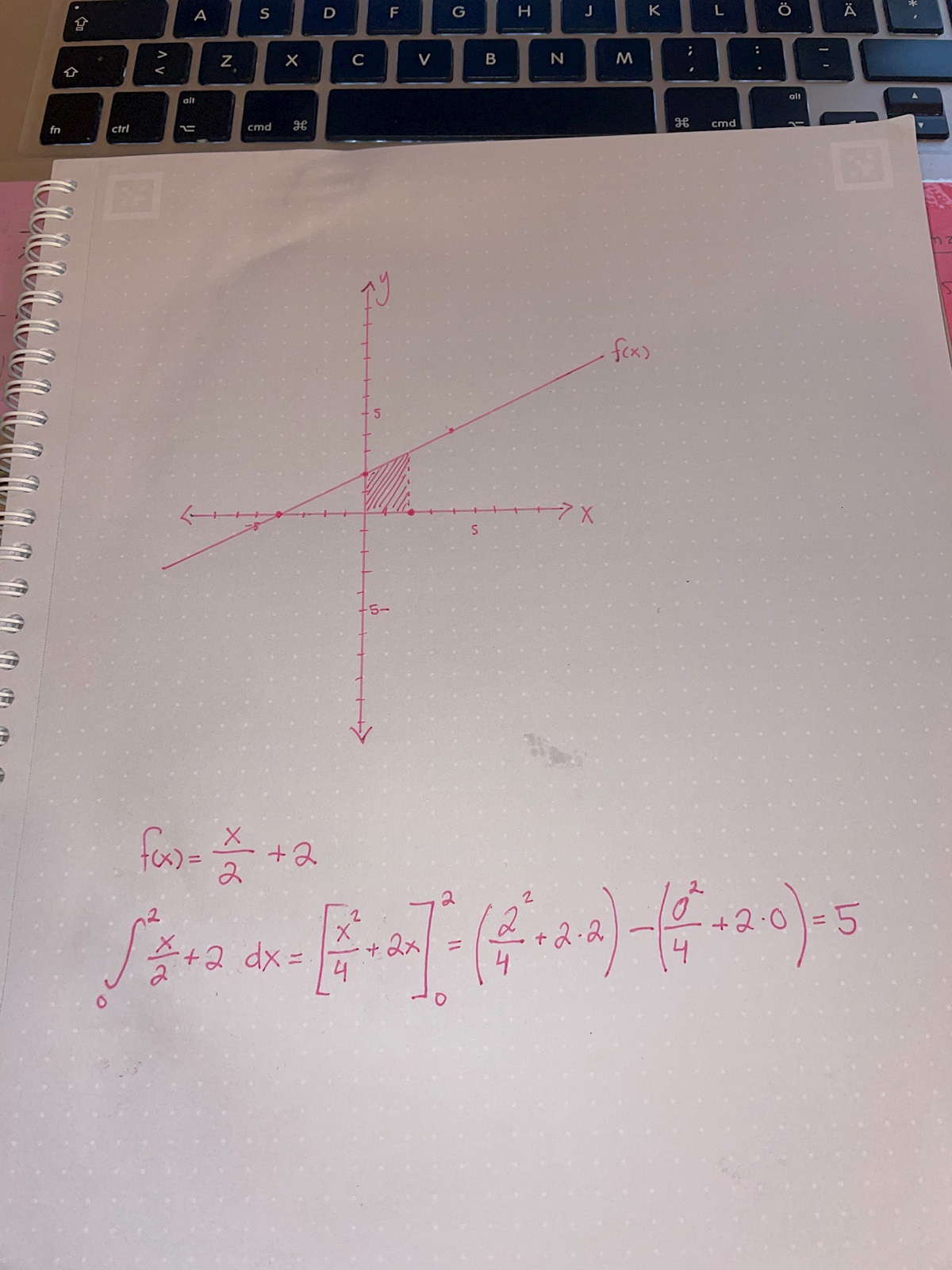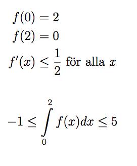 Sockerkakan 1 skrev:Om f(x)=x/2+2 och sedan ritar upp det samt integrerar så får jag det största värdet till 5 vilket är vad som ingår i intervallet, stämmer detta då?