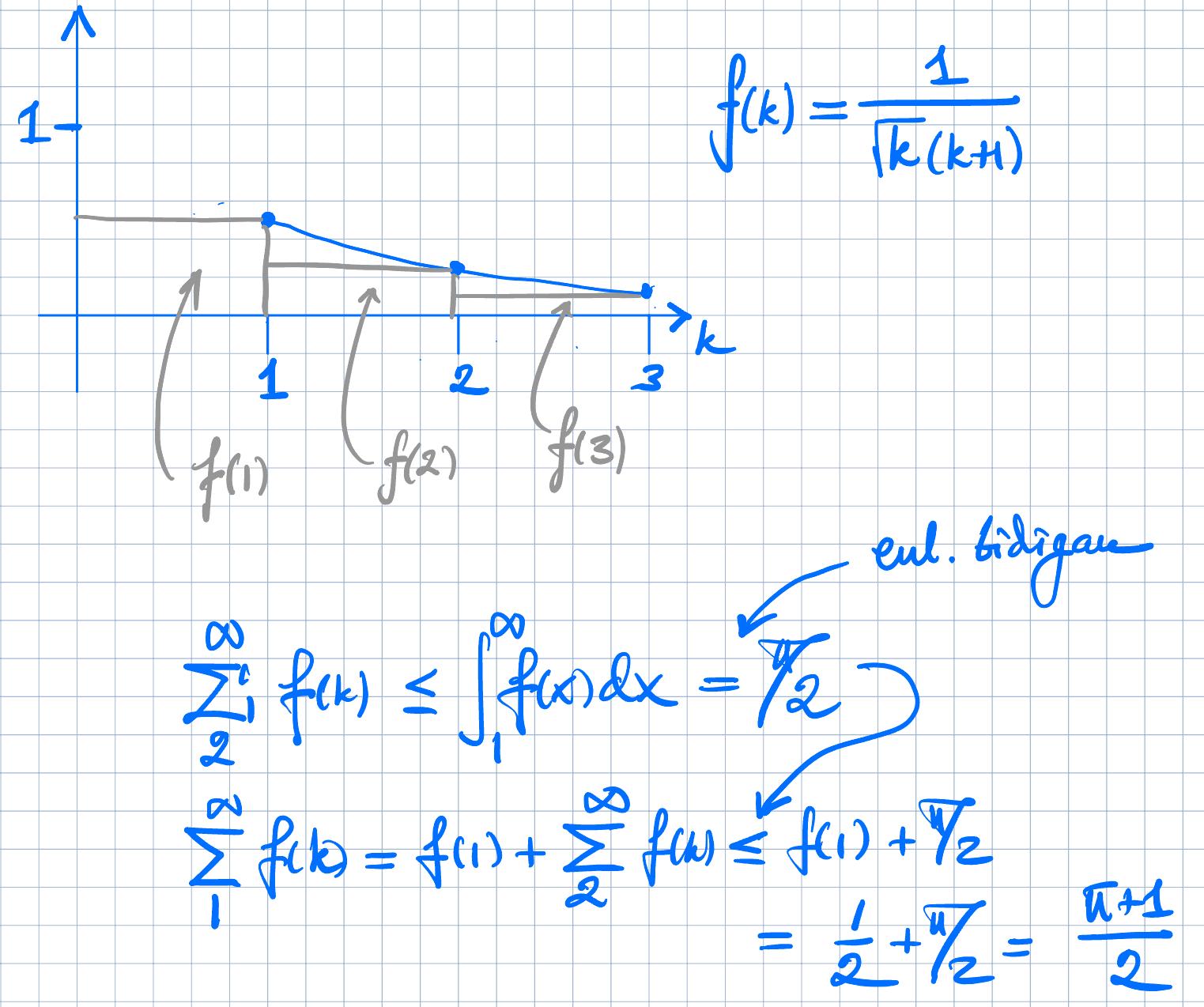 Jag fick avdrag här för att jag inte kan relatera den givna serie integralen med värdet som vi fått från uppgiften och jag vet inte riktigt hur man gör detta förutom att räkna ut integralens värde som vi visste konvergerade mha jämförelsesatsen för serier och sen jämföra det värdet med pi+1/2