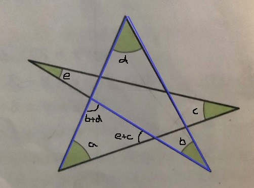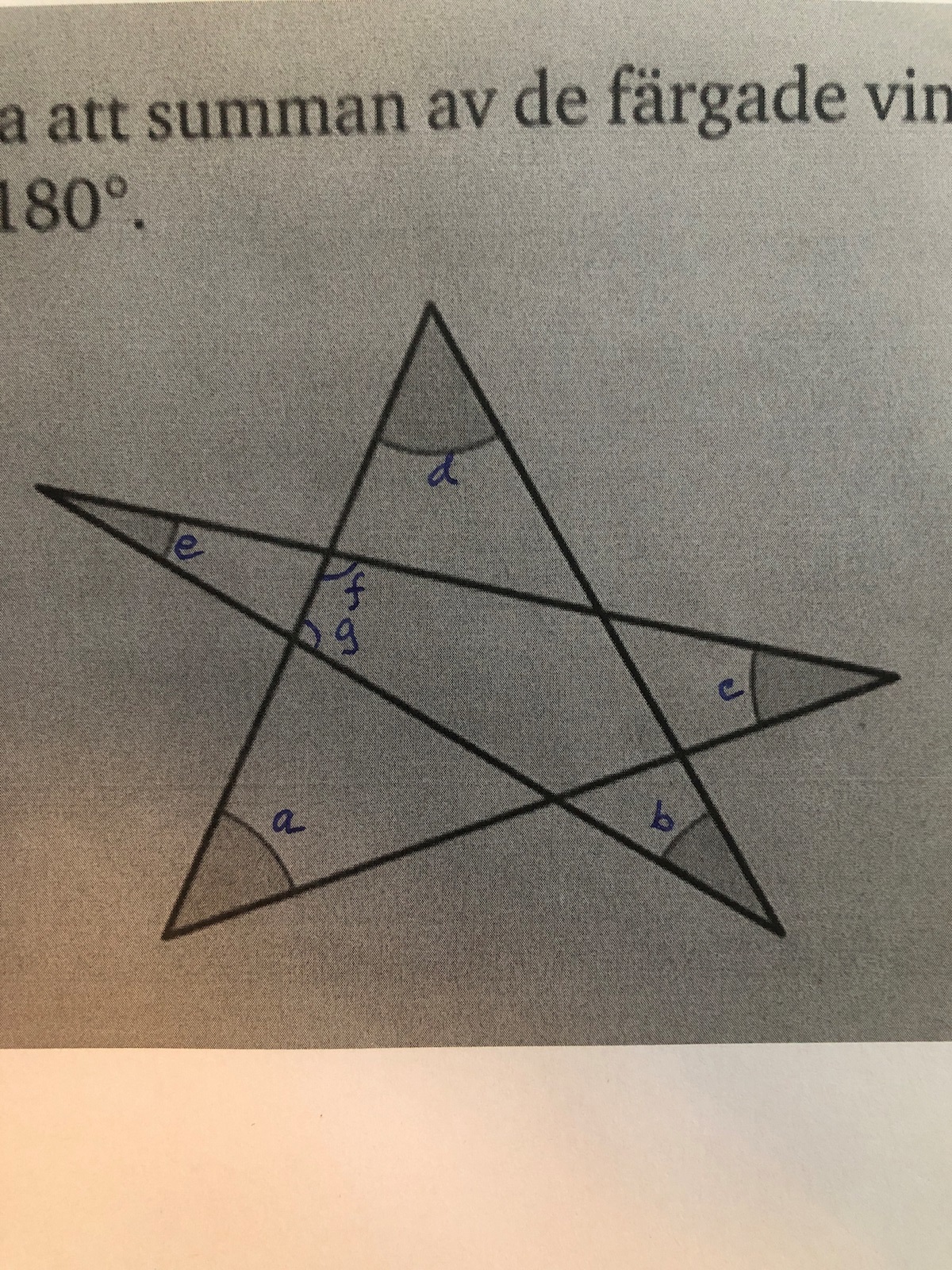 Vinklarna b+d och e+c ges av yttervinkelsatsen.