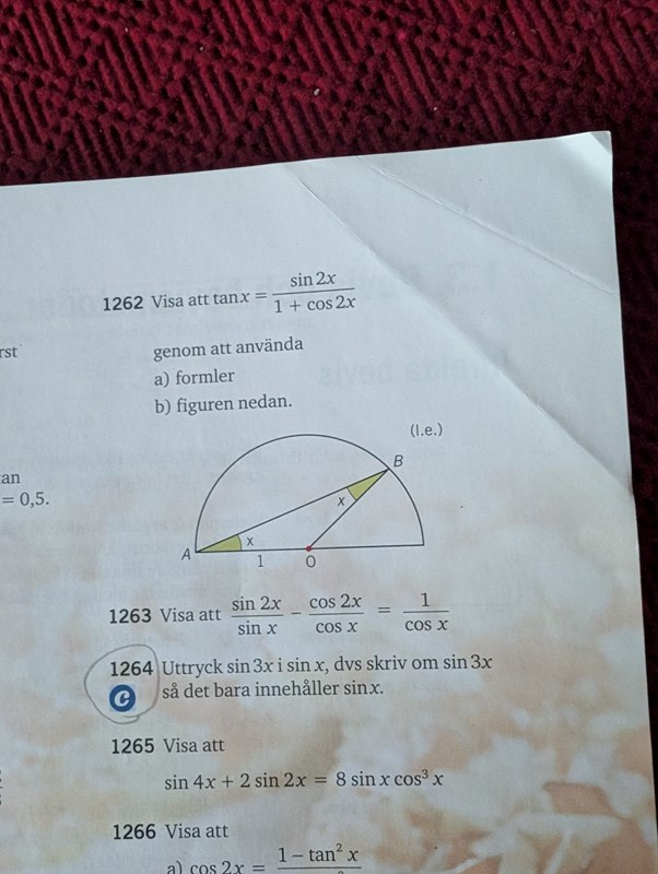 Nu ser jag att du skrivit fel också. Ena kateten i den skuggade triangeln är inte 1+cos(2x), utan bara cos(2x). Hela den nedre kateten AC är 1+cos(2x). Om du tar tangens av vinkeln i A får du BC/AB=tan(x)=sin(2x)/(1+cos(2x)).