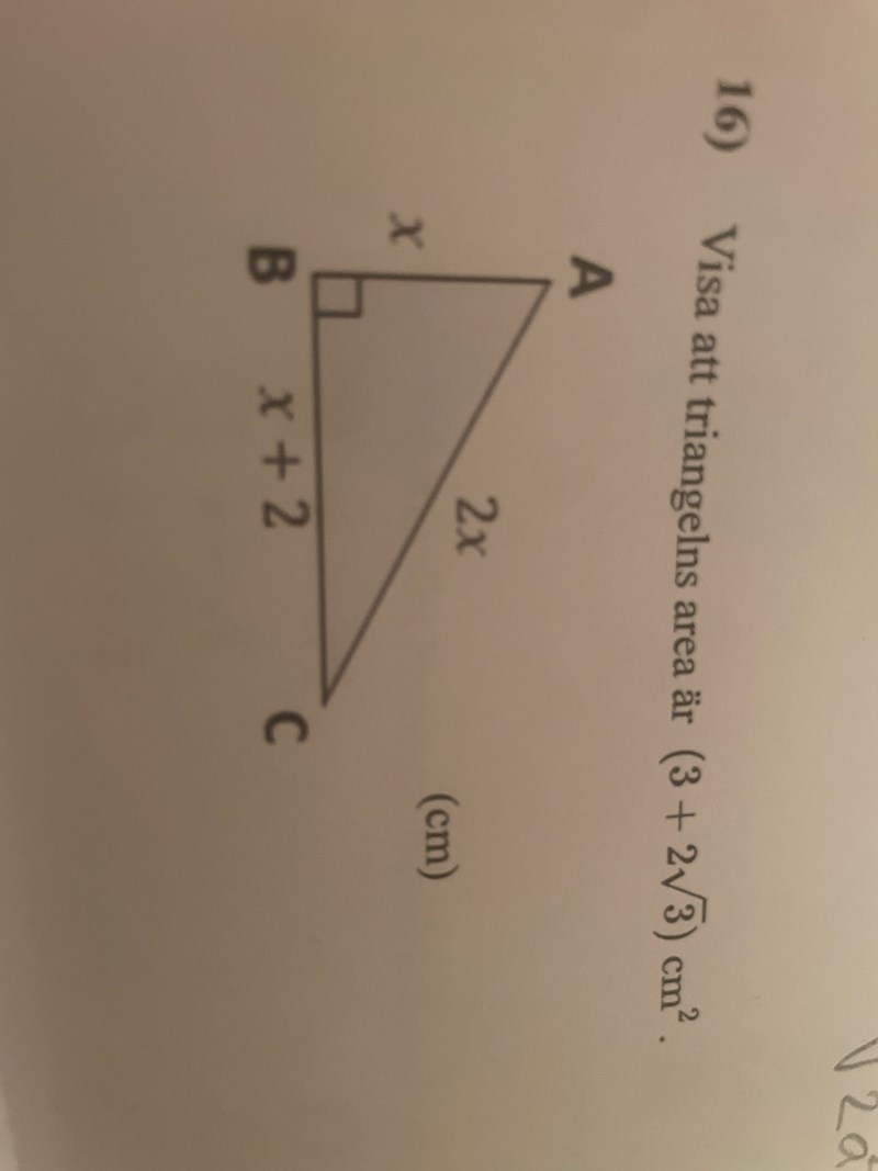 Visa att triangelns area är (3 + 2√ 3) cm^2