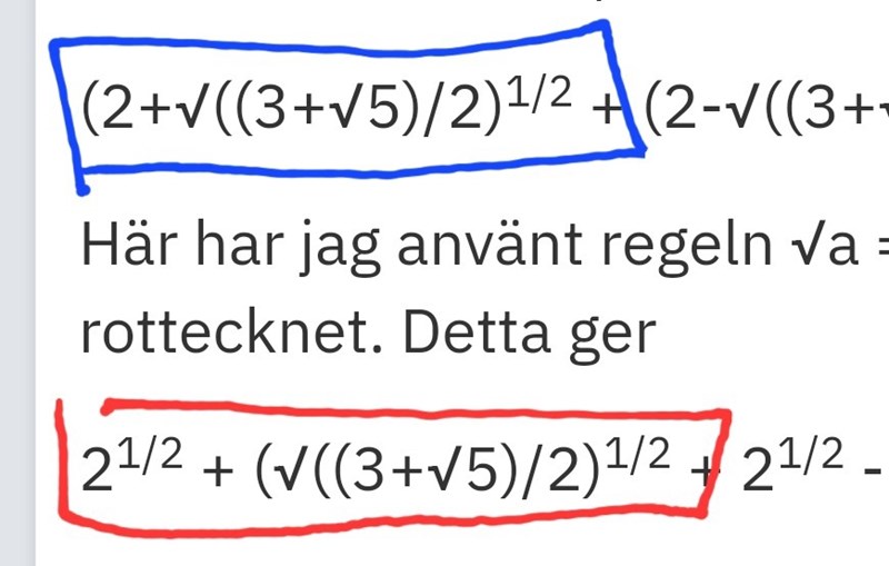 För den första kvadraten som befann sig över hela första termen fick jag den yttersta parantesen (...)1/2 denna parantes gällde alltså hela termen 2+√((3+√5)/2 & likadant har jag gjort för den andra termen (2+√((3+√5)/2)