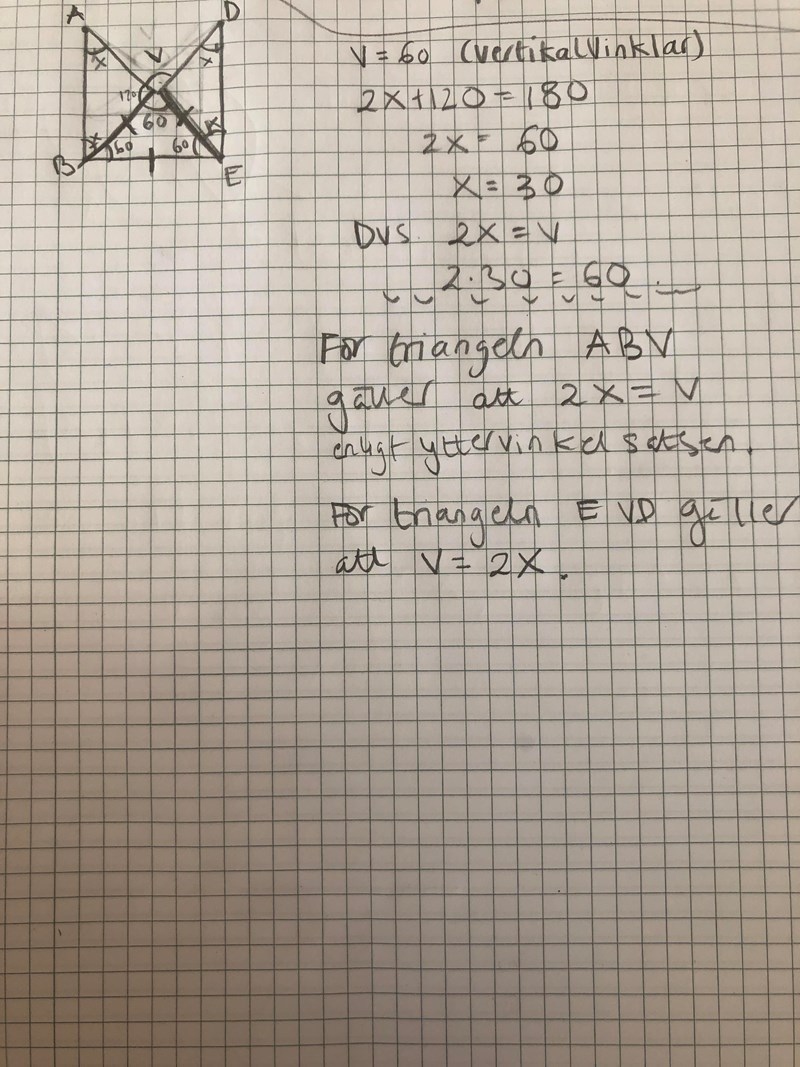 Om jag kallar vinkeln BVE för 2x , då är V också 2x för de är vertikalvinklar. (Såg det i facit) . Hur löser man annars den?