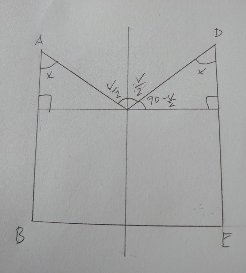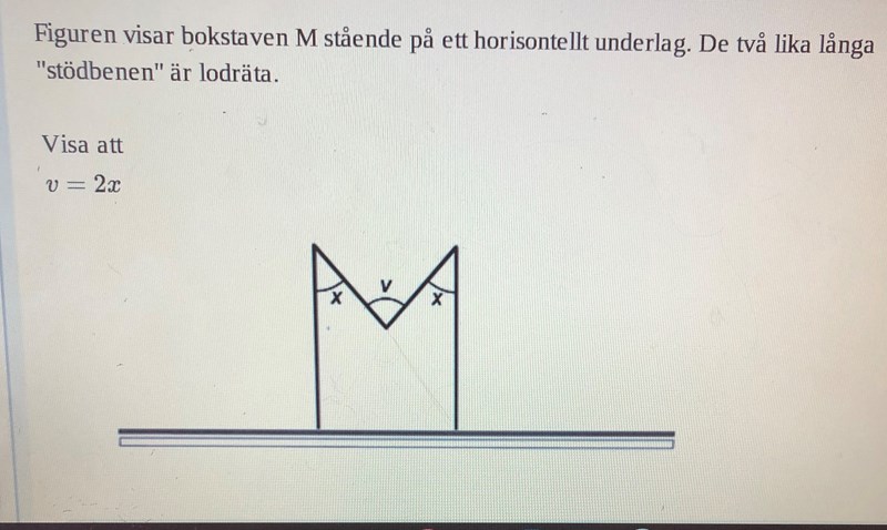 Jag tänkte så här: 90-v/2 +90+x=180 på ena triangeln.