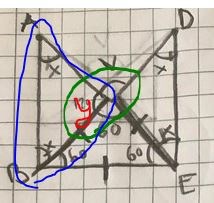 Kalla den vinkeln för exempelvis y. Vilka två samband kan du se för vinkeln y? (glöm den liksidiga triangeln med vinklarna 60 grader)