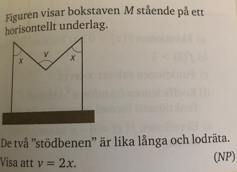 Vinklarna mellan den tänkta toplinjen och stödbenen är räta, alltså 90 grader vardera. Dra bort x från 90 grader. Ett spel med vinkelsumman ger dig det du ska visa.