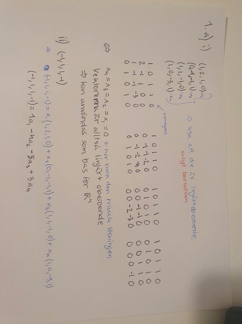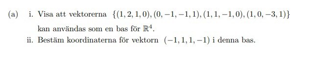 Smutstvätt skrev:Vad bra, då ska vi kika! Din idé stämmer, däremot behöver du kanske motivera den aningen mer än du gjort. Skriv någonting om att du nu har visat att de fyra vektorerna är oberoende, och det innebär att de spänner upp hela , och därmed kan användas som bas för . :)