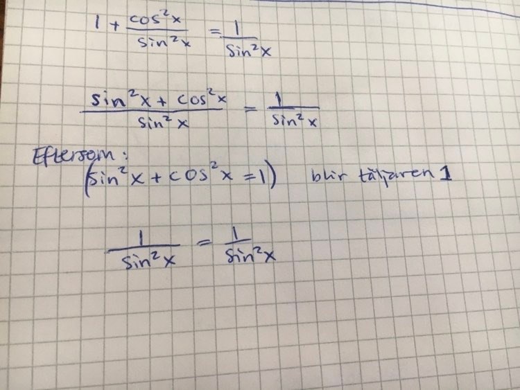 Visa att 1+cos2xsin2x=1sin2x1+\frac{\cos^2x}{\sin^2x}=\frac{1}{\sin^2x}