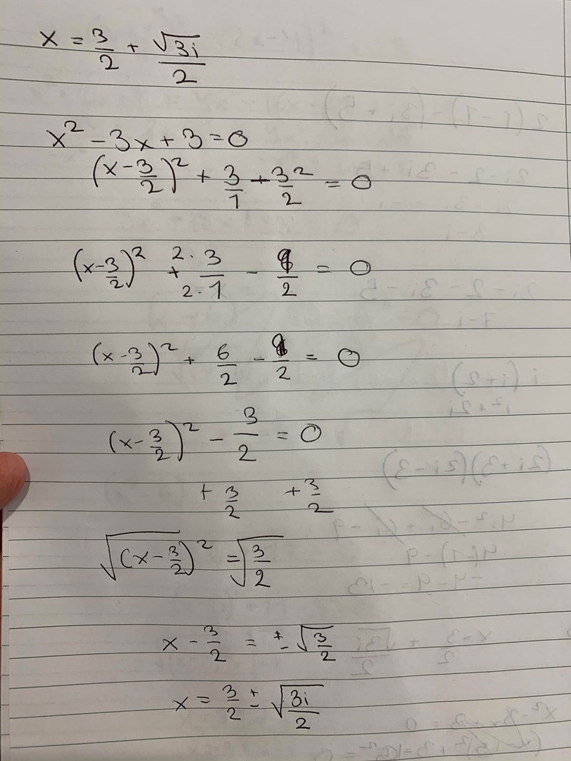 x2-3x+3=0(x-32)2-94+124=0(x-32)2=-34x-32=±-34x=±3i4+32x^{2} - 3x + 3 = 0 \\ \Leftrightarrow (x-\frac{3}{2})^{2} - \frac{9}{4} + \frac{12}{4} = 0 \\ \Leftrightarrow (x - \frac{3}{2})^{2} = -\frac{3}{4} \\ \Leftrightarrow x - \frac{3}{2} = \pm \sqrt{-\frac{3}{4}} \\ \Leftrightarrow x = \pm \sqrt{\frac{3i}{4}} + \frac{3}{2}