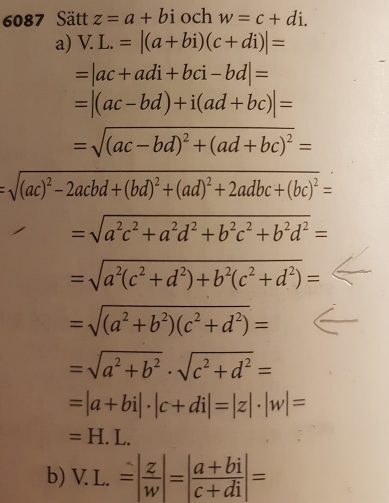På a) vet jag inte hur √(a²(c² + d²) + b²(c² + d²)) = √((a² + b²)(c² + d²)). Och på b) vet jag ej varför man utrycker täljaren som ett absolutbelopp men låter nämnaren vara.