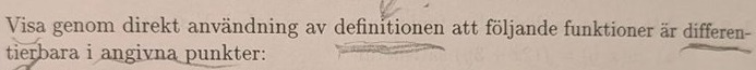 Edit: De menar nog genom definitionen för derivatan. Kolla om derivatan existerar så är den differentierbar då h --> 0. Men det fanns en sats i boken som sa att alla kontinuerliga funktioner är deriverbara men det är väl fel för weierstrass funktioner är kontinuerliga men inte deriverbara eftersom den bara har hörn överallt och hörn kan man inte derivera eftersom man inte vet om derivatan är riktad snett nedåt/uppåt etc eller om lutningen är 0 så den är odefinierad. Kortsagt är inte satsen fel?
