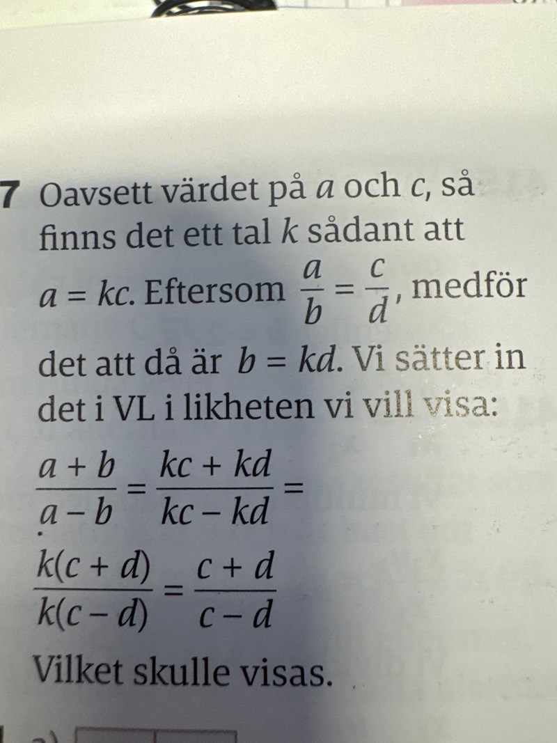 Om.vi nu ersätter a med kc så får vi ekvationen kc/b = c/d, vilket efter förkortning med c på båda sidor ger oss k/b = 1/d, som kan skrivas b = kd.