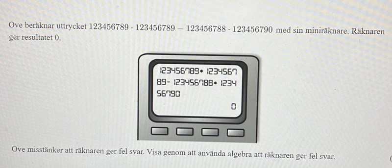 123456788 x 123456790 kommer ju att bli större än 1 så därför vet jag att svaret kommer bli negativt. Men längre än så här kommer jag inte och jag hade verkligen uppskattat om någon kunde förklara hur jag löser uppgiften algebraiskt som det frågas efter i uppgiften!