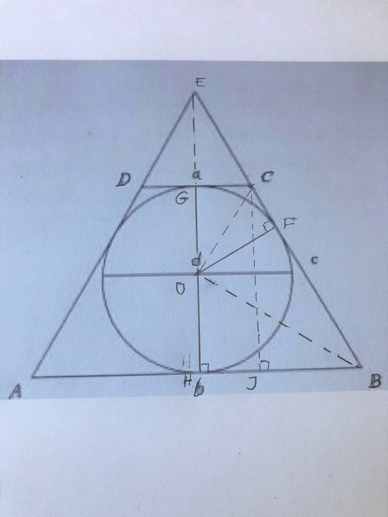 En möjlighet är att jobba med en triangel vars sidor innehåller dessa variabler. Jag skapade en triangel genom att dra en linje från C vinkelrätt mot basen, dvs AB och kallar skärningspunkten för J.
