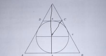 Om din sträcka till C i bilden är lika lång som sträckan från spetsen till C (alla punkterna borde få namn, så det går att att prata om dem), så är det en likbent triangel där, ja, så det kan vara intressant. Försök bevisa det. Jag tror dock inte att det stämmer. Tänk om triangeln vore mycket spetsig.