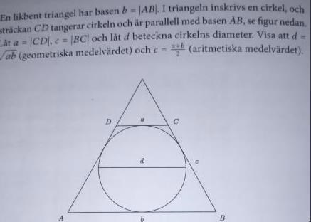 Laguna skrev:Jag ser inte lösningen direkt, men jag skulle börja med att dra några nya sträckor: höjden i den stora triangeln, och radien från cirkelns medelpunkt till där den tangerar triangelns högra sida.