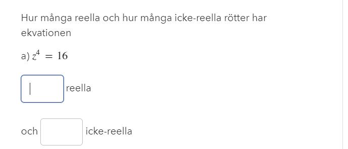Trinity2 skrev:AlexanderJansson skrev:Trinity2 skrev:AlexanderJansson skrev:Trinity2 skrev:Man ser direkt att ±2 löser och då lösningarna är fördelade jämnt på enhetscirkel är de andra lösningarna 90° från de reella, ±2i, 2 reella, 2 icke-reella.