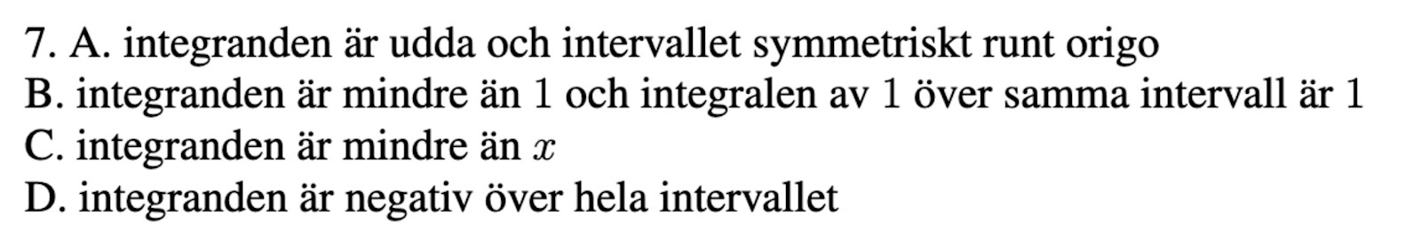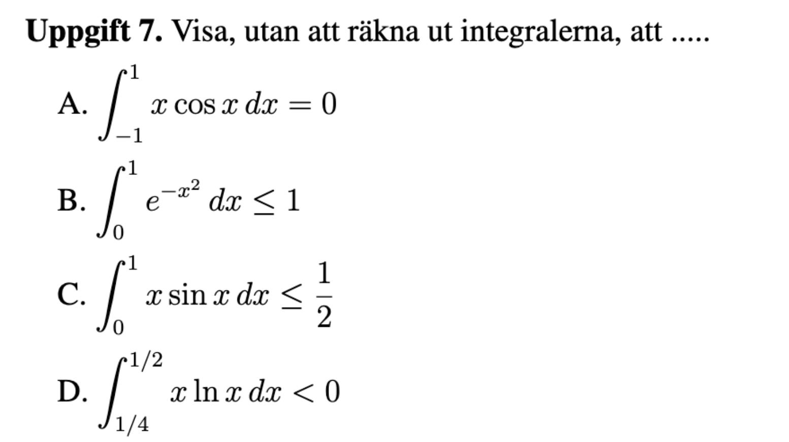 På uppgift C råkade jag veta att xsinx är jämn för att jag hade ritat in den på Geogebra, och så resonerade jag mig till att integralen från -1 till 1 för xsinx skulle vara ≤ 1 och därför är C ≤ 1/2. Facit säger dock så här: