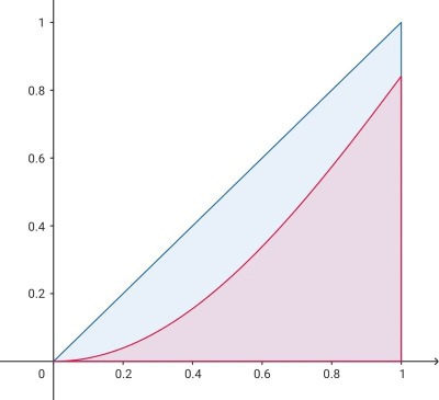 Majskornet skrev:Aaah det blir 1/2! Så "basen" blir som intervallet, 0 till 1, och "höjden" är funktionen, som ju är mindre än 1. Fast varför liknar du det vid en triangel?