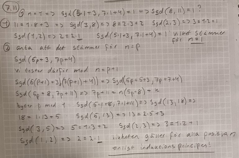 Enligt uppgiften ska jag visa att sgd(5n + 3, 7n + 4) = 1 för alla positiva heltal n. Jag har försökt lösa den med induktionsprincipen enligt bilden nedan och undrar om jag kan göra så då det inte står något om uppgiften i facit.