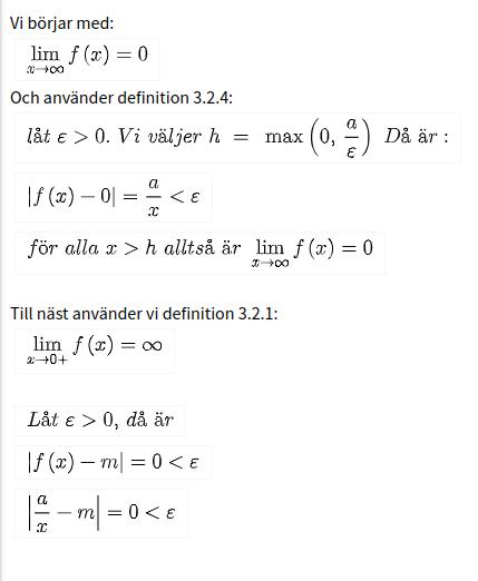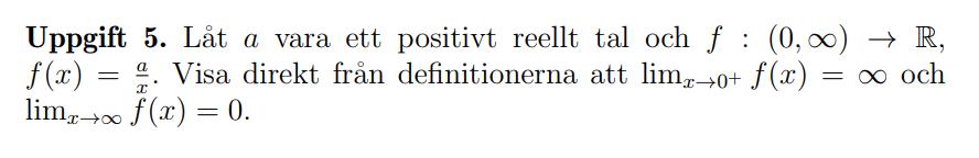 Visa att för varje epsilon finns ett delta sådant att när x > delta så är f(x) > epsilon.