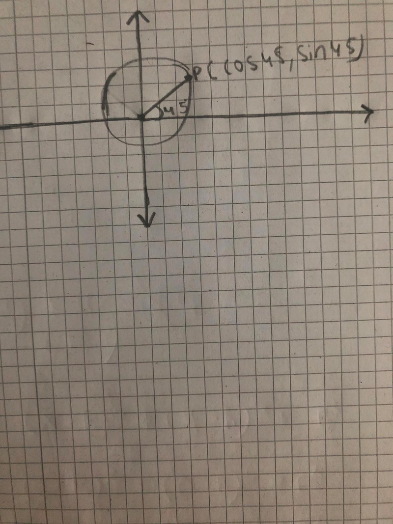 Eftersom vinkeln är 45° så har denna radie lutningen (k-värdet) 1. Det betyder att den horisontella koordinaten och den vertikala koordinaten är lika stora, dvs cos(45°) = sin(45°).