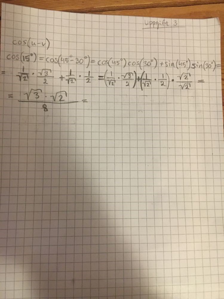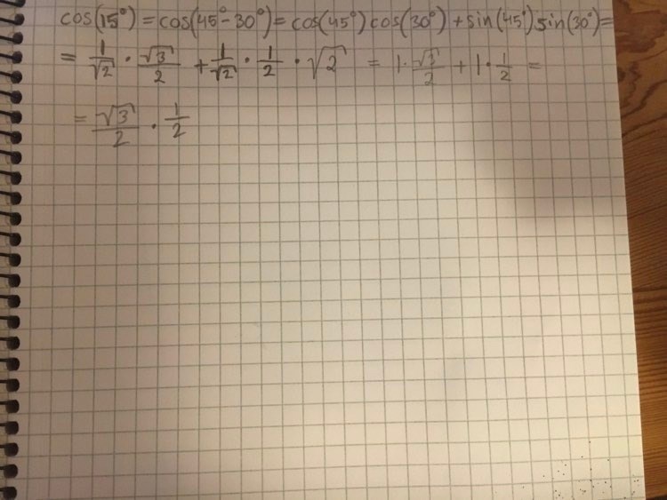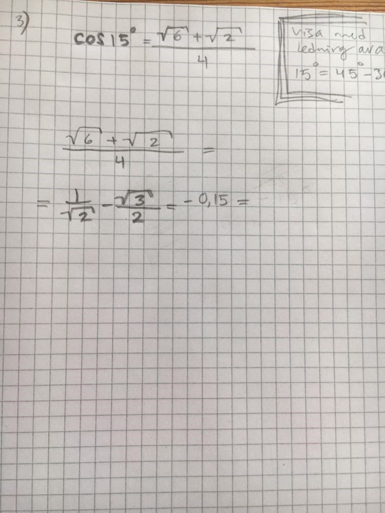 Nej. Du skall inte ta fram ett numeriskt värde för cos(15o), du skall visa att cos(15o) = .