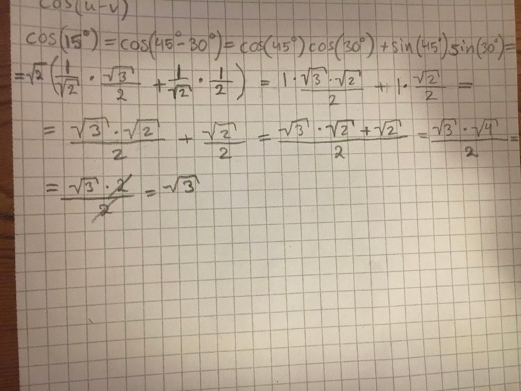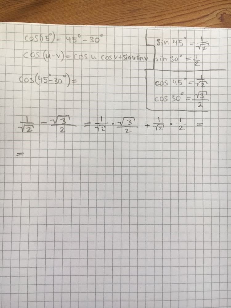 cos(15°) = cos(45°-30°) = cos(45°)cos(30°) + sin(45°)sin(30°) = ...
