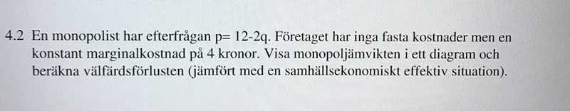 Visa monopoljämvikten i ett diagram och beräkna välfärdförlusten