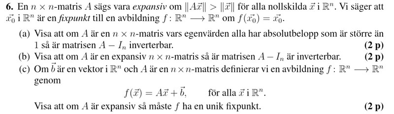 b)om en A är expansiv menar de att eigenvärden inte kan vara 1, eftersom om eigenvektorn norm är lika med ett så betyder det att llAxll = llxll vilket inte går om A ska vara expansiv. det stämmer väl?