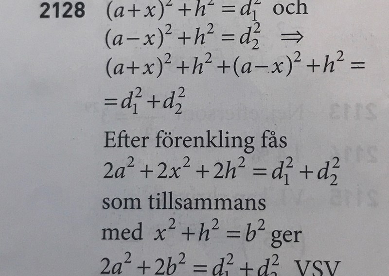 Du har två rätvinkliga trianglar du ser direkt i figuren. En där hypotenusan är d1 och kateterna h och (a+x) Pythagoras på denna ger dig d1. Den andra med hypotenusan b och kateterna h och x som du behöver för att få fram svaret på slutet.