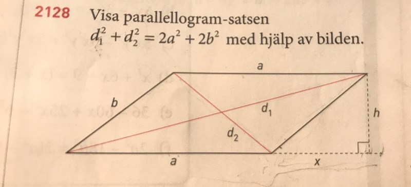 För att få fram d1 ritar du in en höjd i figuren från nedre högra hörnet av parallellogrammet (där x och a möts). Du får då en rätvinklig triangel med hypotenusan d2 och kateterna h och (a-x). Pytagoras på denna lägg ihop d1^2 + d2^2 och ersätt x^2+h^2 med b^2 och du är klar.