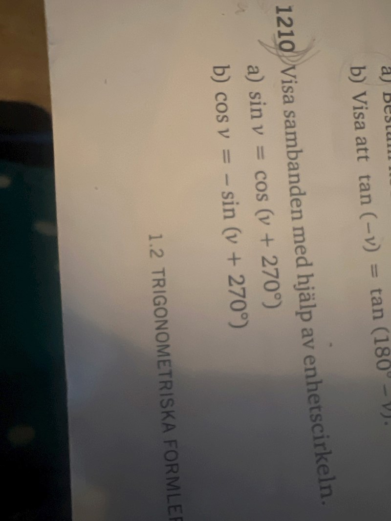 Du kan ju börja med att rita upp enhetscirkeln, hitta på ett värde på v, rita upp linjen som gör att vinkeln mot x-axeln blir v samt rita upp linjen som gör att vinkeln mot x-axeln blir v+270.