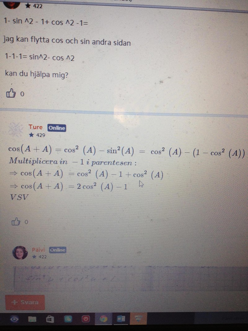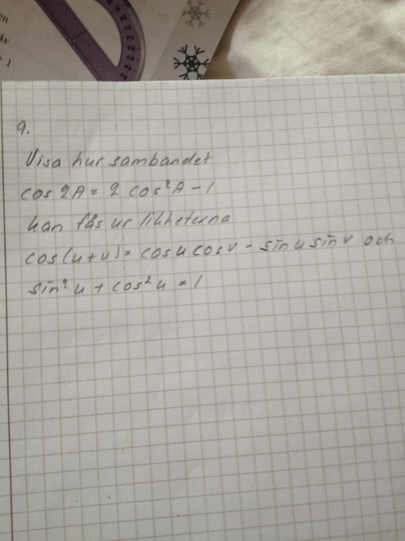 Du skall börja med att sätta in u=A och v=A i formeln cos(u+v) = cosucosv - sinusinv. Eftersom u = v = A kan su skriva i stället för sinAsinA (och likadant för cosinus). Är du med så långt?