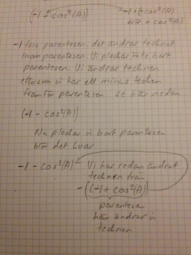 Om du plockar bort parentesen från - ( - 1 + cos ^ 2 (A) ) får du 1-cos^2A, eftersom de båda minustecknen i början blir ett plus tillsammans.