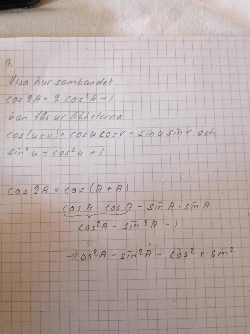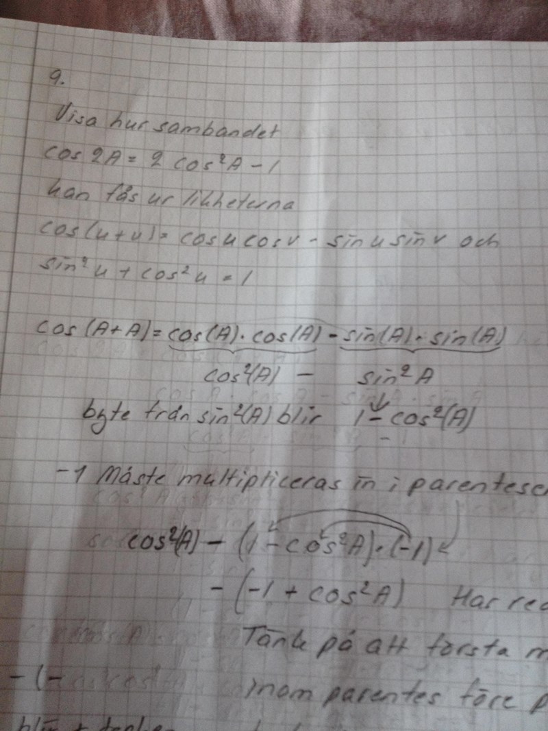 cos^2(A) när vi har minus mellan parentesen ändrar tecken inne i parentesen.