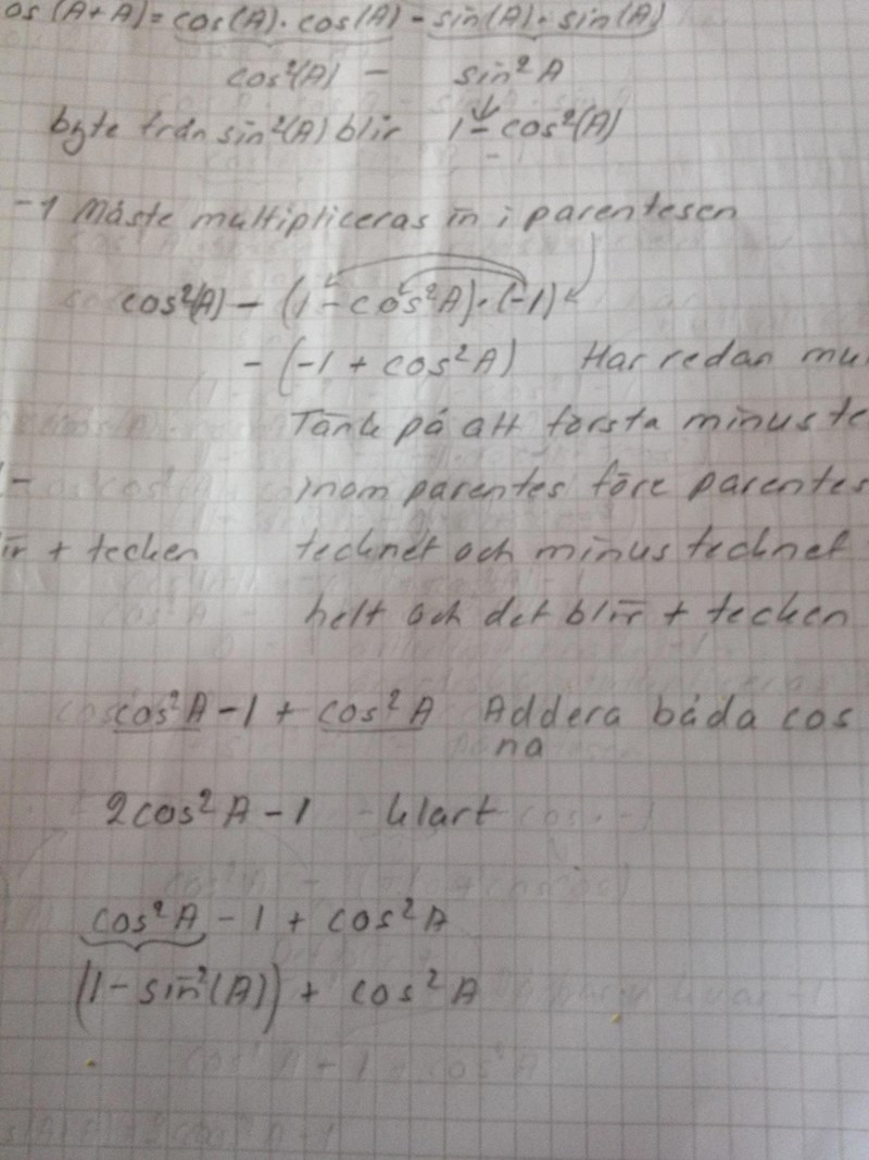 cos^2(A) - 1 + cos ^2(A) addera de båda coskvadraterna