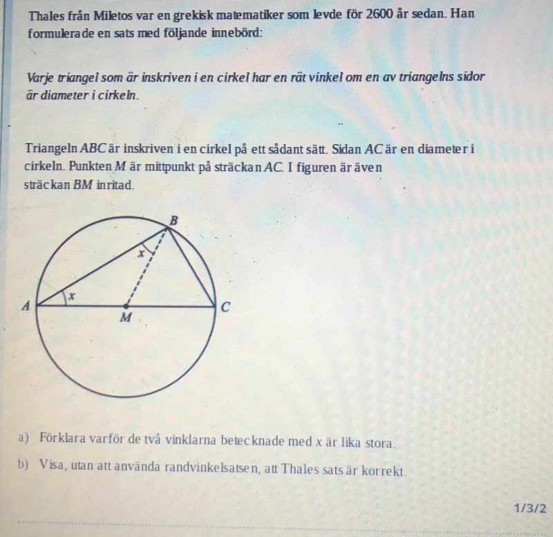 Hej! Har svårt med b uppgiften.. Förstår inte vart den räta vinkeln är?! Det finns ju ingen rätvinkel på bilden?! Det enda jag ser är en liksidig triangel och en likbent triangel. Uppskattar all hjälp!