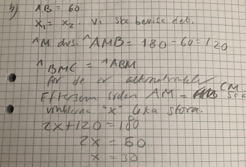 3. räkna ut mbc, uttryck i x Utnyttja det som bevisades i a-uppgiften, samt vinkelsummering i BMC ger