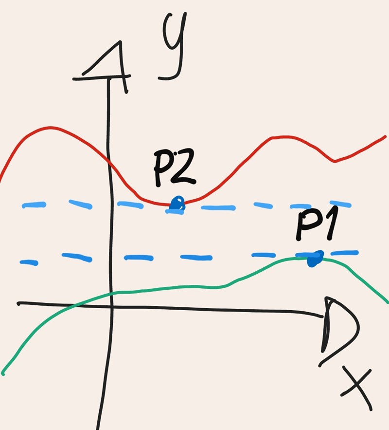 Så här. P1 ligger längre ner än P2. Den undre grafen kommer aldrig ovanför den undre streckade linjen.