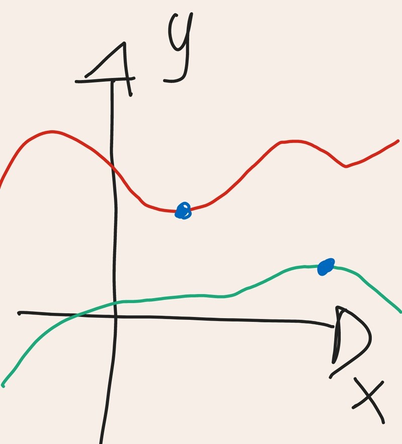 Rita två godtyckliga grafer i ett koordinatsystem där alla punkter på den ena grafen ligger ovanför den andra grafen.