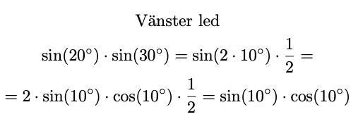 Förenkla ledvis. Använd trigonometriska formler och kända sinus-värden: